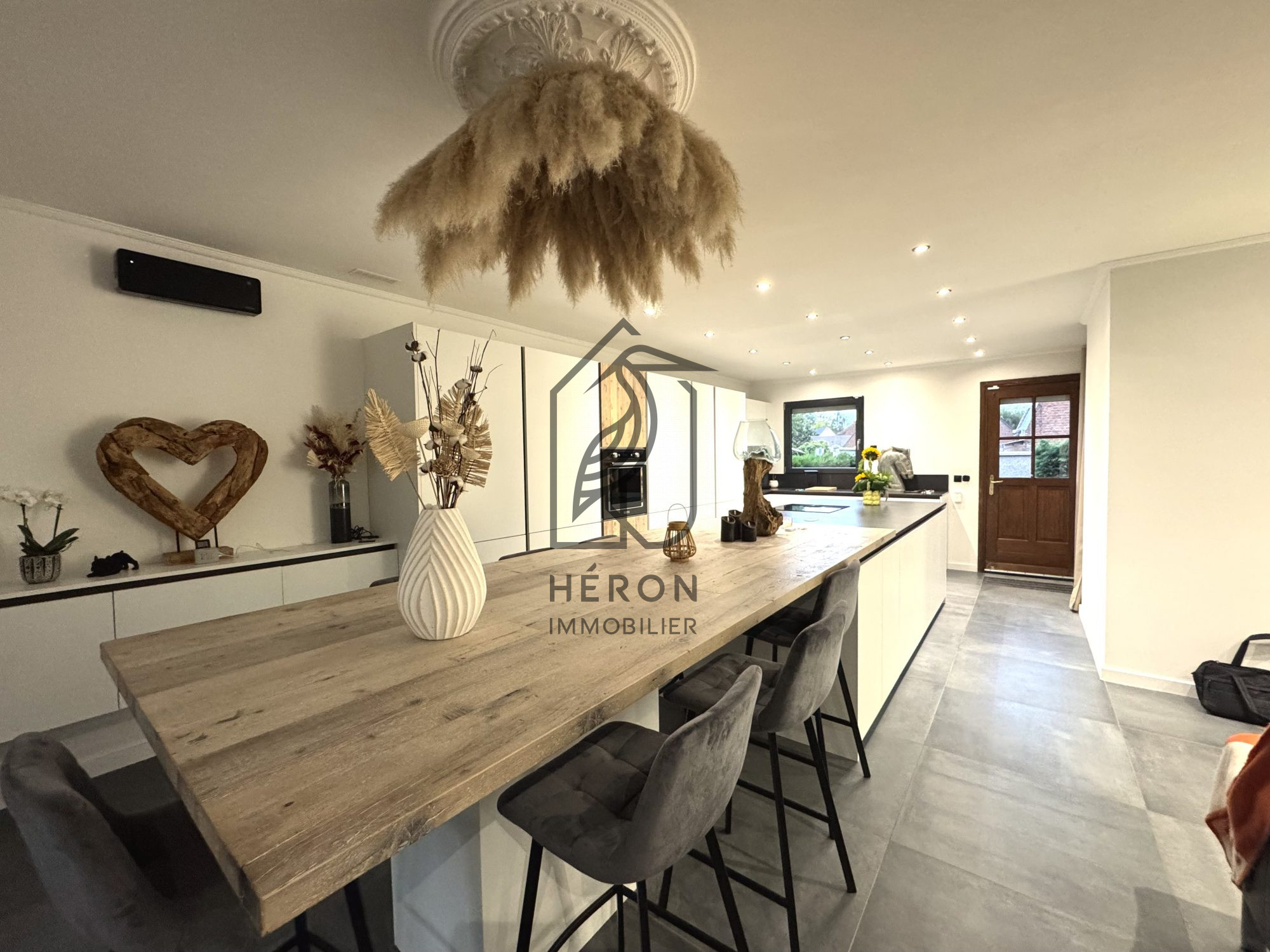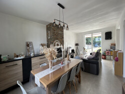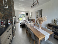 La maison offre une belle pièce de vie lumineuse ouverte sur une cuisine équipée, six pièces au total dont quatre chambres (deux au rez-de-chaussée) et deux salles de bains.