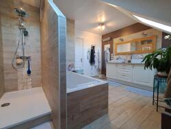 A l'étage, un grand palier desservant 4 chambres et une grande salle de bain avec douche et baignoire , des toilettes(un espace toilette avec lavabo dans 3 des 4 chambres)