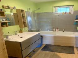 En rez de chaussée, on entre directement dans un grand séjour salon attenant à une belle cuisine équipée et aménagée des beaux éléments. Cette maison dispose également en RDC d'une vaste salle de bain, de deux grandes chambres et WC. Un escalier mène à l'espace nuit du premier étage disposant d'un palier, deux grandes chambres et d'un cabinet de douche.En sus cette maison bénéficie d'un sous-sol complet et d'un grand carport.