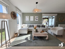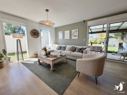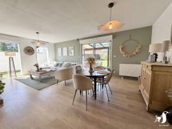 - descriptif : entrée avec dressing, salon ouvert sur salle à manger, cuisine équipée, grande véranda chauffée et habitable à l'année avec vue sur le jardin, couloir de distribution desservant une lingerie, un wc, trois chambres et une salle d'eau avec douche à l'italienne.