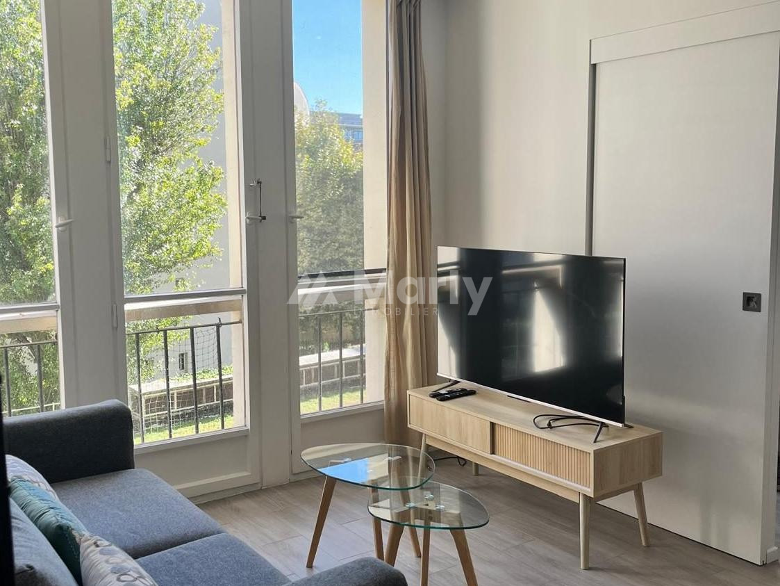 Il se compose d'une entrée, d'un espace séjour avec rangements, d'une cuisine semi-ouverte entièrement équipée ainsi que d'une salle d'eau avec douche et WC. Rénové en 2022, l'appartement est en parfait état et dispose de prestations soignées : fenêtres double vitrage, volets roulants électriques, beau parquet?