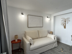 Il comprend : - Un salon / chambre avec canapé convertible, table hautes, chaises ainsi que de nombreux rangements . - Une cuisine entièrement équipée ouverte (réfrigérateur avec congélateur, plaques de cuisson, vaisselle, nécessaire de cuisine), - 1 salle de bain avec rangement. - 1 WC