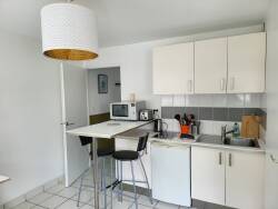 La kitchenette est intégralement équipée (Réfrigérateur, four, plaques vitro céramiques) avec meubles de rangement bas et haut, table-bar et 2 tabourets.