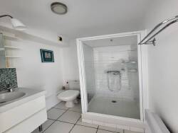 Salle d'eau avec douche, meuble-vasque et WC.
