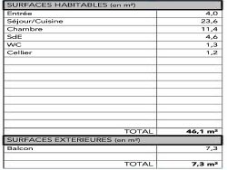 Beau T2 au 3è étage expo sud/ouest + nord/ouest de 46,1m2 : - Séjour 23,6m2, - Chambre de 11,4m2 avec salle d'eau attenante 4,6m2, - Wc séparé, entrée, cellier, - Terrasse 7,3m2 (177cm de profondeur) - Parking sous sol inclus.