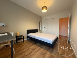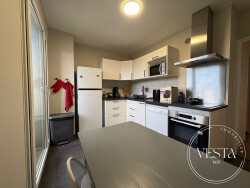 La pièce de vie aux teintes actuelles donne accès au premier balcon. La cuisine est séparée, entièrement équipée avec électroménager neuf bénéficie d'un accès au second balcon.