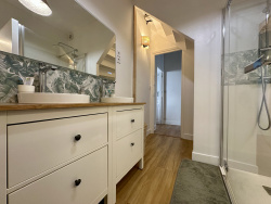 -Sous-sol: Cave; -Rez-de-chaussée: Garage, cave, espace buanderie, entrée, cuisine équipée avec espace repas, séjour donnant sur terrasse, salle d'eau; -1er Etage: Palier, trois chambres dont une avec possibilité création salle d'eau et une avec dressing et WC avec lave mains;