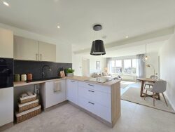 La pièce de vie constitue le véritable coup de coeur de l'appartement. Salon, salle à manger et cuisine s'articulent dans un espace ouvert, baigné de lumière, avec une vraie sensation d'espace et une vue dégagée omniprésente. Depuis les fenêtres, le regard part au loin sur les collines, sans vis-à-vis proche, ce qui renforce immédiatement la sensation de calme et de respiration.