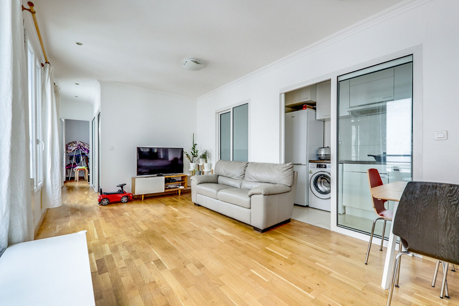 L'appartement bénéficie d'un agencement pratique. Il comprend un beau séjour lumineux, une chambre, une cuisine séparée ainsi qu'une salle de bains et des toilettes. Un balcon est accessible depuis le séjour, offrant un espace extérieur appréciable.