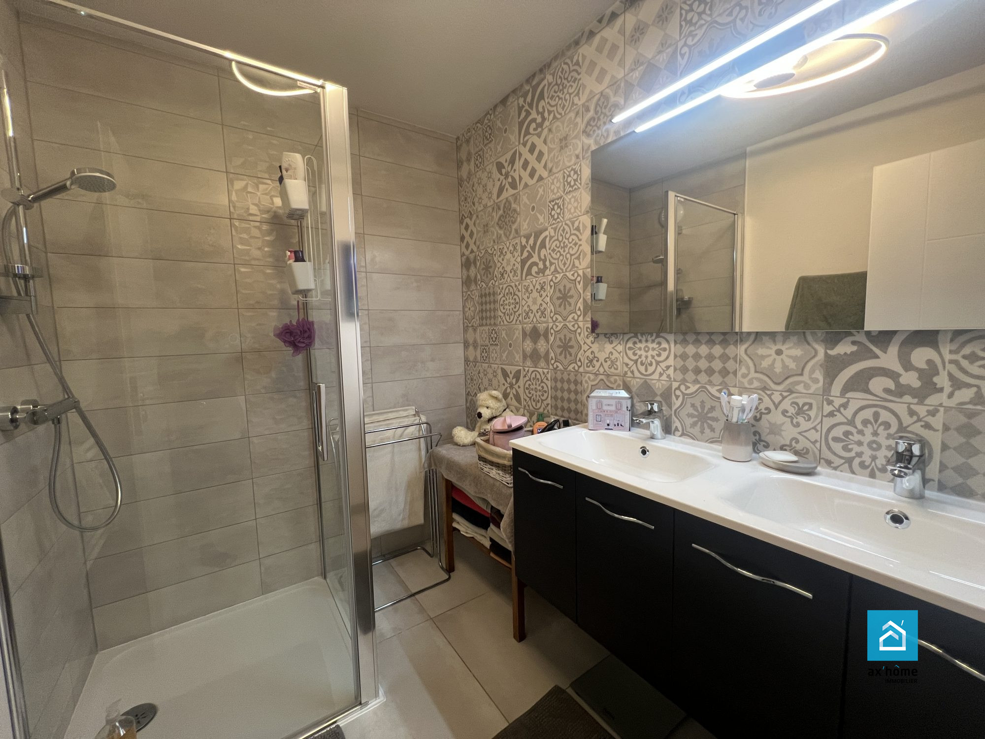 Le logement possède une salle de bain avec espace lave-linge/sèche-linge et un WC séparé avec sur-largeur.