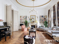 La pièce de réception, d'environ 55 m², constitue le véritable coeur de l'appartement. Lumineuse grâce à de nombreuses ouvertures exposées plein sud et sublimée par une belle hauteur sous plafond et des cheminées décoratives, elle offre un cadre de vie à la fois raffiné et convivial. Ce séjour est prolongé par un salon d'angle chaleureux, baigné de lumière et largement ouvert sur l'extérieur, permettant d'accéder à un balcon où vous pourrez profiter des derniers rayons du soleil en fin de journée.