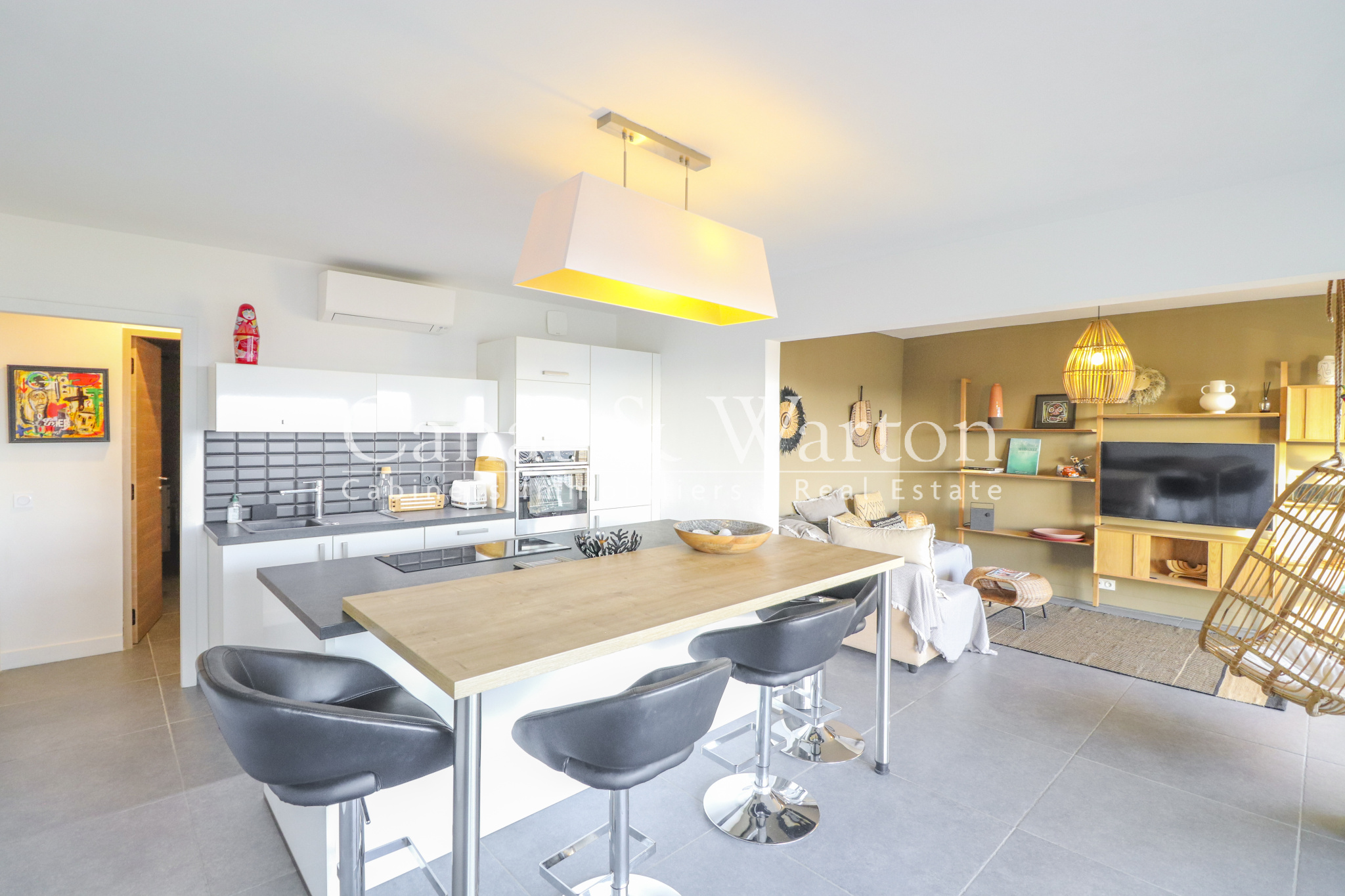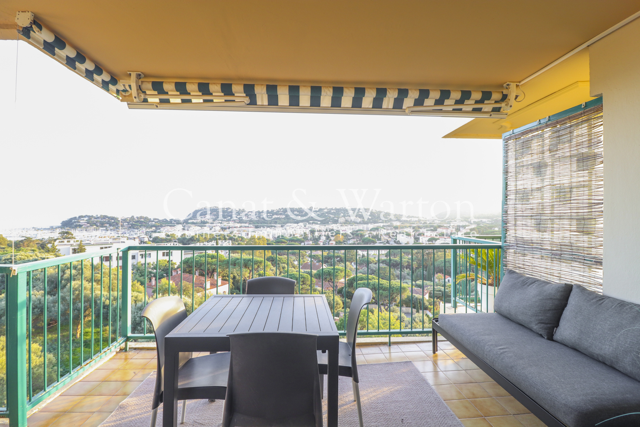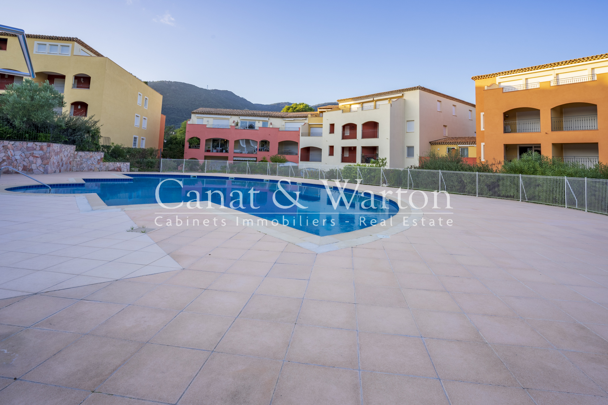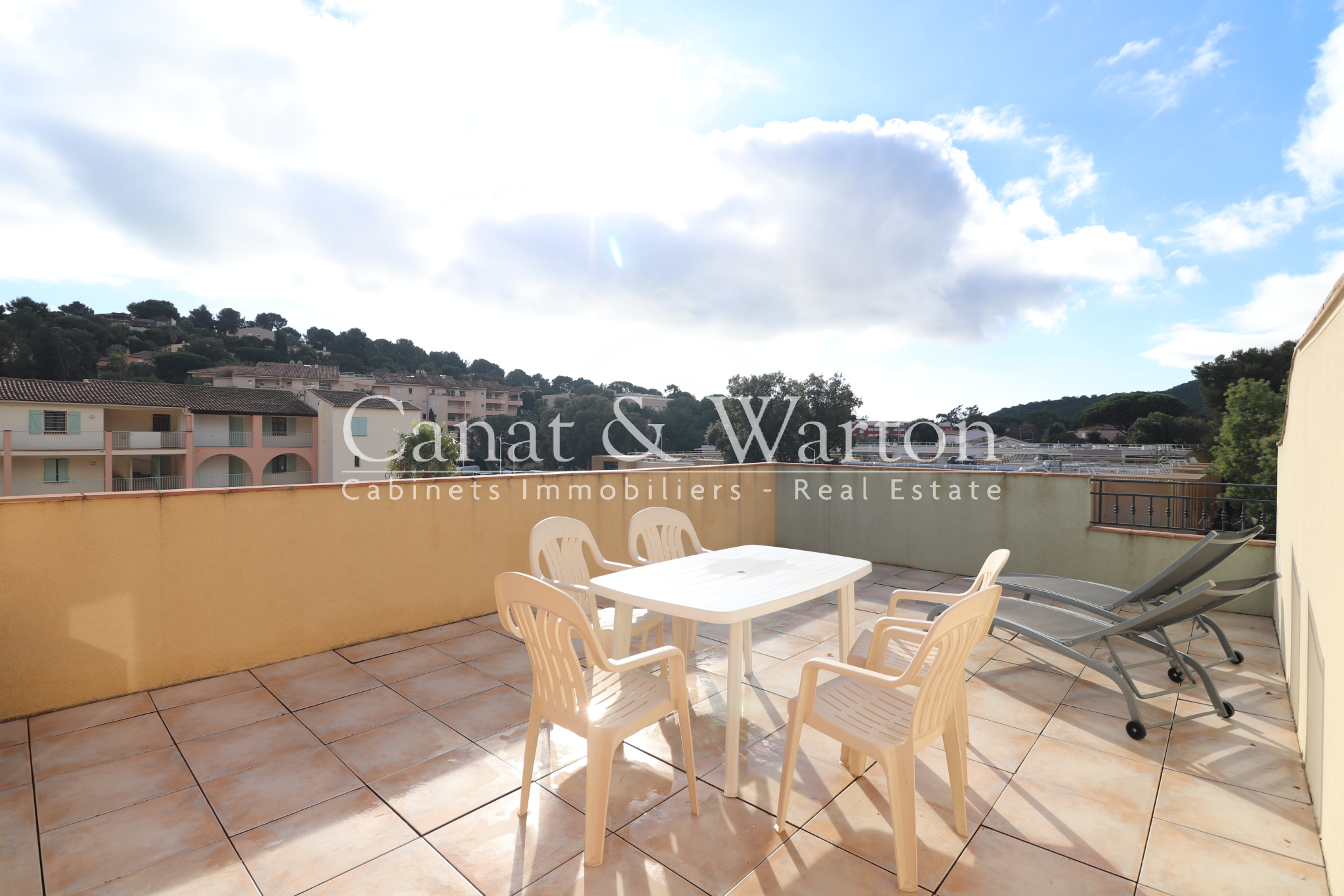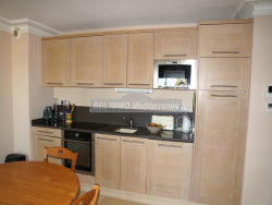Situation idéale : en centre-Ville et au calme ! Résidence de standing, sécurisée et avec Piscine. Ce bel appartement 3 pièces de 62 m2 habitables comprend entrée avec rangement, lumineux séjour avec cuisine ouverte entièrement équipée, 2 chambres avec penderie, salle de bains meublée et avec double vasque, WC avec lave-lains. Terrasse de 10 m2 avec petite vue mer. Cave et Garage privatif en sous-sol. Prestations Haut de Gamme : pierre naturelle (sols et SdB), corniches, climatisation réversible, cuisine en chêne massif cérusé blanc, ascenseur, visiophone, grande piscine 18 m x 9 m. - BEL IMMO Cavalaire - Tél. 04.94.00.44.55. - info@bel-immo.com - www.bel-immo.com -