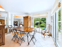 Discrètement située au fond d'une impasse, à seulement quelques minutes à pied de la magnifique plage de Tahiti, cette belle maison familiale de 220 m2 habitables allie confort moderne, luminosité et cadre naturel préservé. Un lieu de vie rare à Névez, pour les amoureux de calme, de verdure et de bord de mer. Implantée sur un terrain arboré de 2 635 m2, l'habitation profite d'une exposition Sud-Ouest qui inonde le salon-séjour cathédrale de lumière tout au long de la journée. Ce dernier, d'une surface d'environ 72 m2, constitue le véritable coeur du foyer avec ses larges ouvertures et sa cheminée, créant une ambiance chaleureuse et conviviale. Le rez-de-chaussée offre une entrée avec vestiaire, une buanderie, une cuisine équipée, le salon-séjour, une chambre parentale avec salle de bains privative, une seconde chambre et une salle d'eau avec WC. À l'étage, une mezzanine distribue cinq chambres supplémentaires, deux salles de bains, un WC indépendant. À l'extérieur, vous profiterez d'une belle terrasse bien orientée, d'un garage fermé, de grandes places de stationnement, ainsi que d'un abri de jardin. Le chauffage est assuré par un système électrique, complété par une cheminée pour plus de confort. Cette propriété est idéale pour une résidence principale, secondaire ou un dessein familial, dans l'un des secteurs les plus prisés du sud Finistère. Un cadre de vie serein, à deux pas de l'océan. Richard Marlin se fera un plaisir de vous accompagner pour vous la faire découvrir ! Les informations sur les risques auxquels ce bien est exposé sont disponibles sur le site Géorisques : www.georisques.gouv.fr - Annonce rédigée et publiée par un Agent Mandataire -