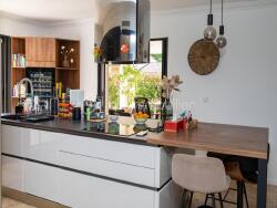 Une fois passé le hall d'accueil, la maison s'ouvre sur un somptueux espace de vie d'environ 90 m², baigné de lumière, avec de larges baies à galandage donnant directement sur les terrasses, le jardin et la piscine. La cuisine ouverte, entièrement équipée, ravira les amateurs de gastronomie avec son ilot central, ses plans de travail en céramique, sa cave à vins intégrée et ses équipements haut de gamme.
