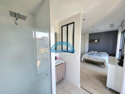 Magnifique Maison d'architecte de 2020 (décennale) vous offrant : entrée avec rangements, séjour triple traversant de 55m2 donnant sur terrasse et jardin orienté plein sud avec piscine à sel (7mx3,80m), cuisine entièrement aménagée et équipée, cellier, une chambre, wc séparé avec lave-mains, buanderie avec douche, grand garage ( borne électrique) A l'étage : un dégagement desservant deux grandes chambres (donnant sur balcon) avec placards intégrés et leur propre salle d 'eau, wc séparé avec lave-mains, une suite parentale donnant sur solarium, grand dressing, grande salle de bain + douche Possibilité de garer deux autres voitures sur la parcelle Combles : Beau volume de stockage ou chambre. Prestations : Plancher chauffant à basse température, climatisation réversible programmable, aspiration centralisée, alarme domotique, caméra, matériaux de qualité, volets électriques, double vitrage alu oscillo-battant, piscine avec aqua bike, pompe à chaleur. vide sanitaire