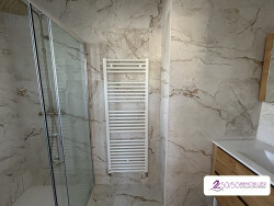 Dans l'espace nuit, le couloir dessert trois chambres dont une disposant de sa propre salle d'eau puis une salle de bains spacieuse (avec douche à l'italienne et double vasque).