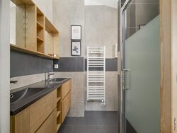 Au rez-de-chaussée : - Spacieuse pièce de vie de 57 m² avec cheminée à insert et climatisation réversibl - Cuisine ouverte entièrement équipée - Hall d'entrée avec rangements intégrés - Espace buanderie fonctionnel - Une chambre avec salle d'eau privative - WC séparé