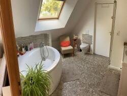 - A l'étage : pièce palière avec rangements, 3 chambres, salle de bains avec wc et un vaste bureau.