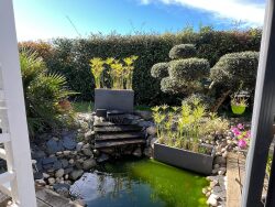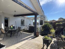 À l'extérieur, le jardin arboré invite à la détente :une terrasse ensoleillée, un cabanon de rangement, ainsi qu'un jacuzzi couvert, composent un espace parfaitement pensé pour profiter en toute saison de moments privilégiés en famille ou entre amis.