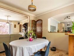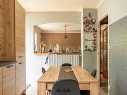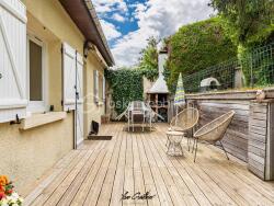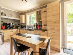 La salle à manger est semi ouverte sur une spacieuse cuisine de 14 m2 entièrement REFAITE en 2021 ainsi qu'un accès direct sur la terrasse en bois.