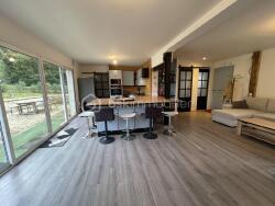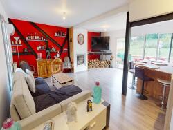 Maison familiale a 2 minutes en voiture du centre ville (village médiéval) comprenant une entrée sur pièce de vie lumineuse avec cheminée, une cuisine aménagée ouverte, un cellier, un accès au garage, et un WC séparé.