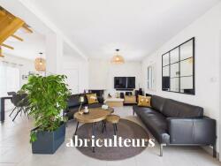 Une large baie vitrée prolonge l'espace vers la terrasse de 30 m² et le jardin paysager.