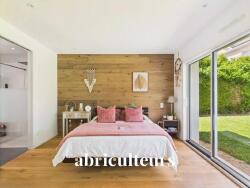 Le rez-de-chaussée accueille une véritable suite parentale (extension réalisée en 2021) avec parquet en chêne, dressing sur-mesure à portes galandage en aluminium, salle d'eau moderne avec double vasque, sèche-serviettes et accès direct au jardin grâce à une grande baie vitrée. Cet espace bénéficie du confort du chauffage au sol.