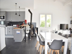A 400m de la plage et des commerces, cette jolie maison de 94m2 comprend une entrée, une pièce de vie avec un poêle à bois, une cuisine aménagée ouverte, un wc séparé, dégagement, une salle d'eau, trois chambres dont une avec sa salle de bains, wc, et une autre avec sa salle d'eau, wc, une 4ème petite chambre mansardée. Belle terrasse exp sud avec une piscine chauffée (3mx5m), un local technique. Indépendant un garage de 24m2 env. Beau terrain clos et arboré. Les informations sur les risques auxquels ce bien est exposé sont disponibles sur le site Géorisques : www.georisques.gouv.fr