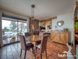 Maison traditionnelle construite en 1981 sur très grande parcelle de 8.752 m² située en zone agricole protégée. Cette maison (121 m² habitables + 127 m² d'annexe) avec sa vue large sur le plateau et exposée soleil levant comprend sur deux niveaux : - Au rez-de-chaussée une terrasse donne accès à l'entrée sur la salle à manger, une cuisine américaine, un salon cathédrale avec cheminée à foyer ouvert, une chambre, une entrée Ouest, une buanderie et rangements, un cellier, wc séparés, salle d'eau rénovée. Accès direct à un double garage, un double atelier et espace de stockage. - Au premier étage, deux chambres, une salle de bains avec wc, une mezzanine donnant sur le salon, un espace bureau. Accès aux combles offrant la possibilité d'aménagements.