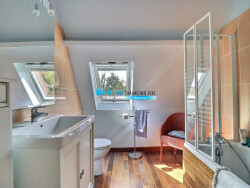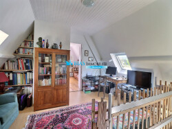 À l'étage, une pièce palière actuellement aménagée en bureau distribue deux belles chambres, dont une avec rangements intégrés, ainsi qu'une salle de bains avec WC.