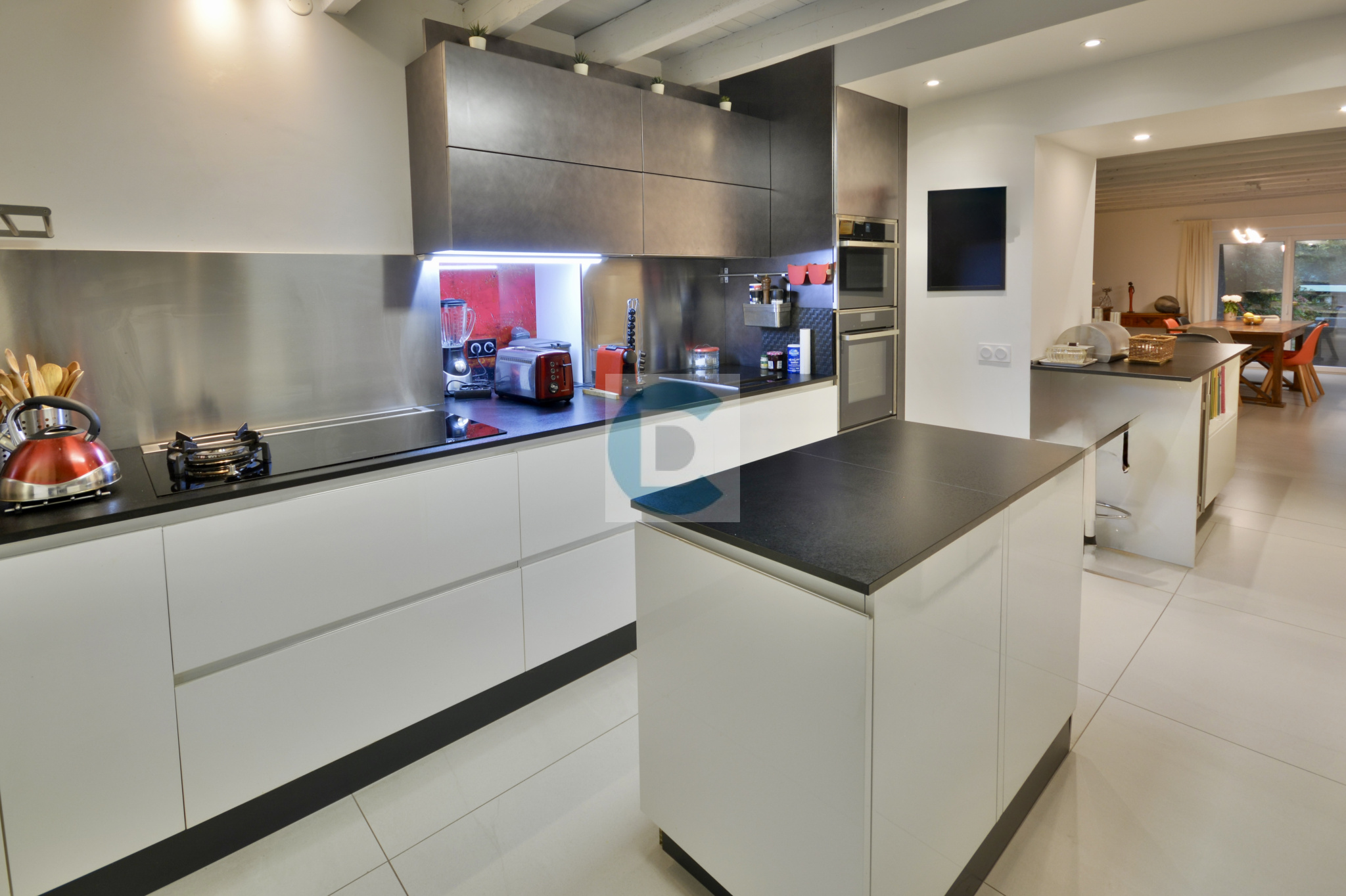 Une très grande surface de habitable pour la partie principale répartis sur quatre niveaux permettent de retrouver des pièces avec de beaux volumes et une grande hauteur sous plafond.