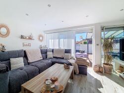 La maison dispose d'un grand séjour lumineux avec cuisine ouverte entièrement équipée, ouvrant sur une spacieuse terrasse idéale pour les repas en extérieur.