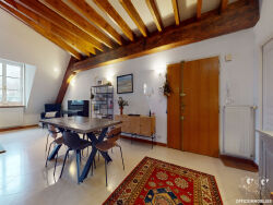 Votre agence OFFICE IMMOBILIER vous propose en EXCLUSIVITE à BESANCON - BOUCLE ce grand appartement situé au deuxième et dernier étage avec ascenseur d'un bel immeuble en pierre répertorié monument historique. Cet appartement traversant et singulier, propose au calme, et en plein centre ville de Besançon, de belles prestations et une configuration rare ! Datant du XVIème, ce bien d'environ 170 m² au sol sur trois étages a été totalement réhabilité avec goût. Une fois le pas de porte passé, on découvre la grande salle à manger ouverte sur le salon et la cuisine de 16m² équipée haut de gamme avec hotte à extraction extérieure. Les volumes sont imposants et la lumière omniprésente. Les nombreuses poutres en chêne qui ornent le plafond et structurent cette grand pièce de vie diffusent une atmosphère chaleureuse. Et puis, vient l'espace salon, quel spectacle ! C'est en levant les yeux que l'effet waouh prend tout son sens : à la façon d'un plafond cathédral, c'est toute la structure savante de la charpente qui s'offre au regard, ajoutant une dimension visuelle et esthétique distinctive à ce beau volume. On retrouve sur ce niveau une suite parentale de 25m² (chambre, SDB, dressing). C'est par un élégant escalier que l'on accède aux étages, 2 chambres avec chacune leur SDE et WC (17 et 19m²), un bureau (ou chambre) de 20m² au sol (poss. SDB), ainsi que de nombreux rangements, placards dans toutes les chambres. Cet appartement hors normes avec vues bien dégagées est très lumineux, possède de beaux volumes. Il est aussi très fonctionnel avec ses innombrables rangements. Les sols sont en pierre et en parquet chêne. Deux grandes caves voûtées parachèvent ce bien d'exception. Enfin, deux nouvelles chaudières à condensation promettent de bonnes performances énergétiques ( DPE C ). Et pour finir, n'oublions pas l'accès sécurisé avec VIGIK et alarme. Vous êtes séduits ? Alors contactez, sans tarder, votre agence Office Immobilier afin d'échanger avec le conseiller en charge de ce dossier et de programmer une visite de ce bien exceptionnel qui vous permettra véritablement de mesurer et d'apprécier tout son potentiel !