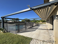 Grand séjour lumineux ouvrant sur la terrasse, Cuisine ouverte haut de gamme entièrement équipée avec espace repas, Salon convivial prolongé par une terrasse ombragée sous pergola bioclimatique, avec vue sur la piscine, WC invités indépendant.