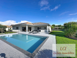 Biganos, entre le port et le centre, à 1,8Km de la gare, cette maison contemporaine T5 parfaitement entretenue profite de prestations remarquables et très belles surfaces. De plain pied, les 182m2 habitables sont parfaitement agencés et aménagés ! L'entrée dessert une belle pièce de vie triple exposition de 70m2 avec cuisine haut de gamme et prolongée par une terrasse couverte permettant de profiter de l'extérieur toute l'année. L'espace nuit, avec 4 chambres (toutes avec placard ou dressing) dont 2 belles suites, offre à chacun confort et intimité. Pour le côté pratique, on apprécie également l'arrière-cuisine et la buanderie. Côté confort, le chauffage au sol par géothermie et la PAC réversible sont complétés par des panneaux solaires rendant cette maison très peu énergivore. Le garage double attenant (carrelé) de 46m2 est un réél atout pour vos véhicules ou besoin de stockage, et l'on profite également d'un second garage-atelier. Le terrain de 1300m2 est parfaitement aménagé et nécessite très peu d'entretien. La vaste terrasse et la cuisine d'été enjoliveront vos moments de détante au bord de la piscine. Confort, prestations et aménagements font de cette maison un nid douillet à découvrir ! Classe énergie : B. Honoraires inclus à charge acquéreur 3,9%.