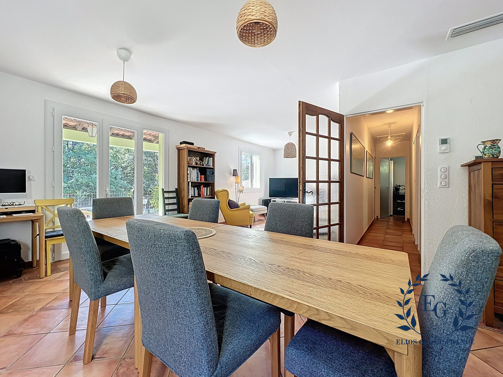 Vous serez séduit par son patio intérieur, parfait pour vos moments de détente, ainsi que par sa grande terrasse offrant une vue panoramique à couper le souffle sur la campagne environnante.
