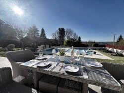 Magnifique bungalow individuel de 4 chambres, aux finitions haut de gamme et offrant une vue imprenable. L'intérieur comprend un espace de vie moderne et ouvert avec chauffage au sol, incluant un spacieux séjour/salle à manger avec portes-fenêtres donnant sur la terrasse arrière, une cuisine entièrement équipée avec îlot central/bar, également avec accès à la terrasse, une suite parentale avec salle d'eau et dressing, trois autres chambres doubles, une salle de bains supplémentaire et des toilettes séparées. Un garage intégré et une buanderie complètent ce bien. Si l'intérieur est impeccable, le véritable atout réside dans l'extérieur : un terrain privé d'environ un demi-hectare offrant une vue spectaculaire sur la vallée. Vous y trouverez une piscine, une terrasse couverte avec coin repas et cuisine d'été idéale pour profiter des douces soirées d'été et recevoir des invités en plein air. Un double abri voiture, un grand cabanon de jardin et une serre complètent cette propriété. Une visite s'impose !