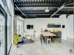 Les bureaux évoluent sur 2 niveaux avec au rdc un open space coworking distribué autour d'une cuisine équipée et d'un coin salon. Sur le même niveau vous trouverez une phonebox, deux remises pour le stockage, un vestiaire et un WC PMR.