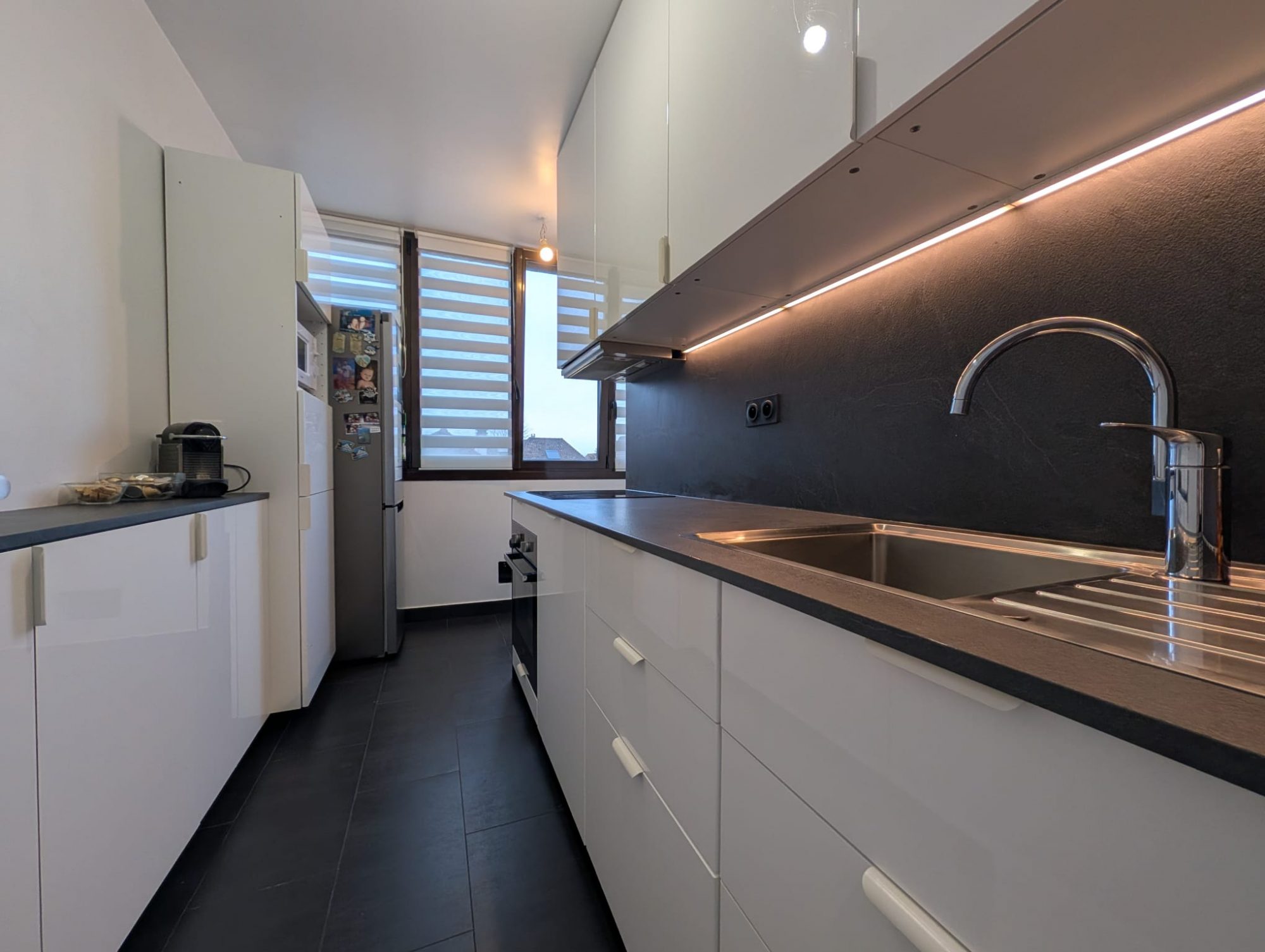 Entrée avec placards, Séjour exposé OUEST avec Balcon et cuisine semi-ouverte (possibilité d'ouvrir ou de fermer intégralement), chambre ouverte sur séjour permettant un plus grand volume de celui-ci (possibilité de refermer pour obtenir une seconde chambre), dégagement donnant sur WC séparé avec placard, salle de bains avec niche pouvant accueillir un placard, chambre.