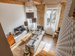 L'entrée donne sur une belle pièce de vie baignée de lumière et une cuisine ouverte aménagée et équipée. La mezzanine a été aménagée et accueille une chambre et une chambre d'enfant (peut-être réaménagée en bureau). Une salle de bains avec WC vient compléter l'ensemble. Vue dégagée sans vis-à-vis ! L'appartement est vendu avec une cave en sous-sol.
