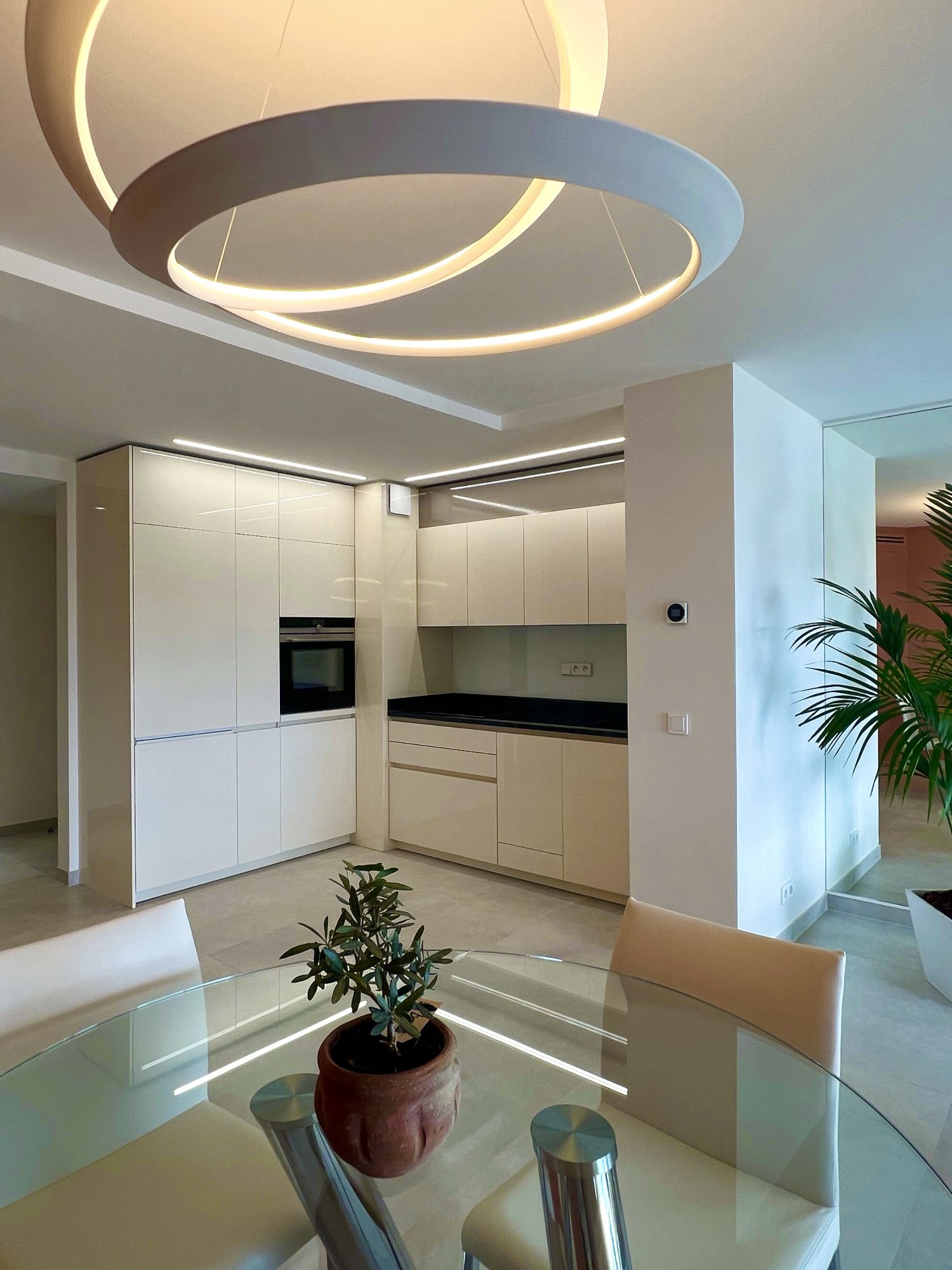 américaine équipée ouvrant sur une terrasse avec vue panoramique sur la baie de Cannes, toilette invité, deux chambres avec leur salle d'eau privative.