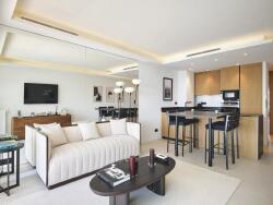 américaine équipée ouvrant sur une terrasse avec vue panoramique sur la baie de Cannes, toilette invité, deux chambres avec leur salle d'eau privative.