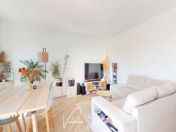 La pièce de vie, orientée plein Sud, est baignée de lumière et s'ouvre sur une cuisine contemporaine entièrement équipée.