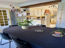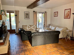 Édifiée sur un terrain de 389 m², la maison principale propose au rez-de-chaussée une entrée avec rangements, un toilette avec lave-mains, une cuisine aménagée avec coin repas, ainsi qu'un vaste salon-séjour de 42 m² agrémenté d'une cheminée à foyer ouvert.