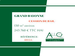 A vendre droit au bail dans le centre du grand Bayonne, emplacement 1 dans rue piétonne pour ce local commercial de 130m2 en parfait état avec WC et point d'eau, visuel et linéaire vitrine en plus! Le local bénéficie également d'une grande réserve,100m2 environ. Loyer mensuel/HT/HC: 3166 euros Prix/TTC/HAI: 243 760 euros Référence:4812A « Les informations sur les risques auxquels ce bien est exposé sont disponibles sur le site Géorisques : www.georisques.gouv.fr ».