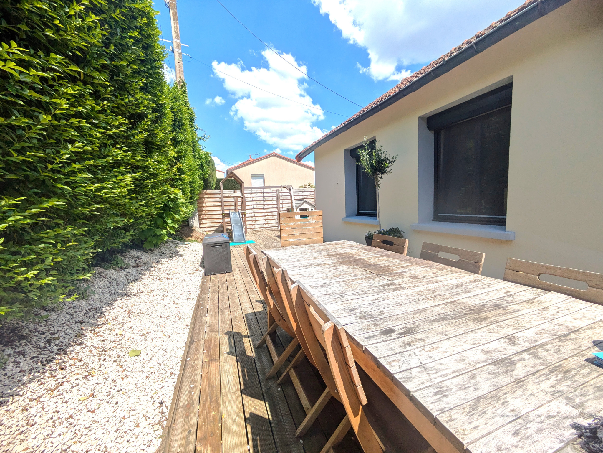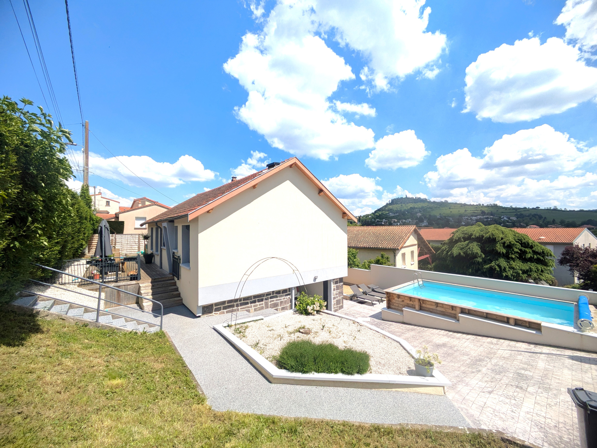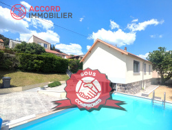 MAISON RECENTE A VENDRE A CEYRAT (63122) Maison d'habitation récente (2021) de 120 m2 hab. environ sur terrain clos et arboré de 533 m2. ( accés chemins verts ) Comprenant: -Rez-de-chaussée: Entrée, cuisine aménagée, équipée et ouverte sur salon/ séjour double ( expo. Est/ Sud/ Ouest) et donnant accès sur terrasse et terrain, dégagement, une chambre, salle d'eau et WC indépendant; Garage 25m2 avec porte sectionelle + parking -1er Etage: Dégagement, trois chambres avec placard avec accès sur terrasse chacune salle de bains avec baignoire et douche italienne , WC indépendan Piscine carrelée 10x3 m sur terrain à l'abri des regards Meuniuseries allu ,volets roulants électriques Chauffage électrique par le sol ( thermostat programmable dans chaque pièce ) Chauffe eau thermodynamique ( heures creuses / heures pleines ) Prestations de qualité !