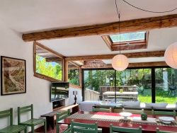 Nichée dans un cadre naturel exceptionnel, au coeur du secteur prisé des Chavants dans la vallée de Chamonix Mont-Blanc, cette maison mitoyenne séduira les amoureux de la montagne et des grands espaces. Située à proximité immédiate de la télécabine du Prarion, elle offre un accès privilégié aux domaines skiables et aux nombreux sentiers de randonnée. D'une surface totale d'environ 145 m2, la maison s'organise sur deux niveaux et se distingue par son architecture atypique parfaitement intégrée à son environnement naturel. Elle propose de beaux volumes et une atmosphère chaleureuse idéale pour les séjours en famille ou entre amis. L'espace de vie, particulièrement lumineux, bénéficie de larges ouvertures offrant de superbes vues sur les massifs environnants. La maison comprend cinq chambres, quatre salles de bains et deux WC, permettant d'accueillir confortablement de nombreux occupants. À l'extérieur, un agréable espace vert avec un petit ruisseau de montagne en contrebas invite à la détente et au ressourcement. La terrasse, idéalement orientée, constitue un véritable prolongement de l'espace de vie pour profiter pleinement du cadre alpin. Trois places de stationnement complètent ce bien. Alliant emplacement privilégié, charme et fonctionnalité, cette propriété représente également une excellente opportunité d'investissement locatif dans un secteur très recherché. Un bien rare à découvrir sans tarder selon les conseils de votre agence Alpes & Chalets
