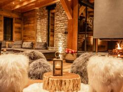 Style : Chalet récent avec soubassement en vieux bois, mélèze et pierres naturelles