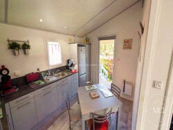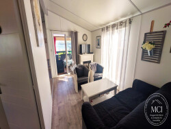 Il s'agit d'un modèle Corbi 56 de la marque Cistebois (anciennement RXL), parfaitement entretenu et comprenant : une pièce de vie lumineuse avec cuisine ouverte, aménagée et équipée (plaque de cuisson, hotte, réfrigérateur/congélateur, lave-vaisselle). un espace nuit : deux chambres confortables, dont une avec dressing. une salle d'eau avec douche et un WC indépendant. une grande terrasse couverte et abritée pour profiter de la vue en toute saison, complétée par un bel espace enherbé. Le terrain dispose de deux places de parking privatives directement sur la parcelle.