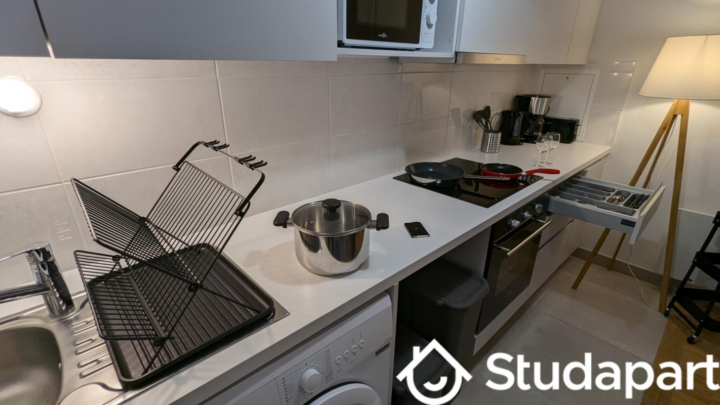 - Cuisine équipée incluant un frigo, un micro-ondes, vaisselle, poêles et casseroles, ustensils de cuisine ;